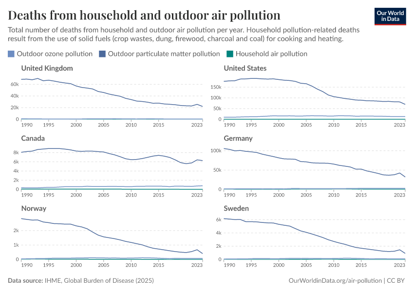 Note that when we add all of these individual risk factors — indoor particulates, outdoor particulates, and outdoor ozone — the total comes to 8.3 million, which is higher than the Global Burden of Disease reports on aggregate. This is because different risk factors can combine to increase health problems and the risk of premature death. In this article, our colleague, Saloni Dattani, examines how risk factors are estimated and why they can’t be summed up to give the total number of premature deaths.