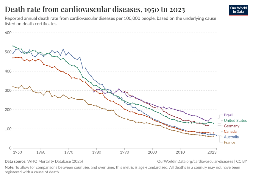 Saloni Dattani (2025) - “Death rates from cardiovascular disease have fallen dramatically — what were the breakthroughs behind this?” Published online at OurWorldinData.org. Retrieved from: 'https://data-faostat-update-datasets.owid.pages.dev:8789/20260119-084543/cardiovascular-deaths-decline.html' [Online Resource] (archived on January 19, 2026).BibTeX citation