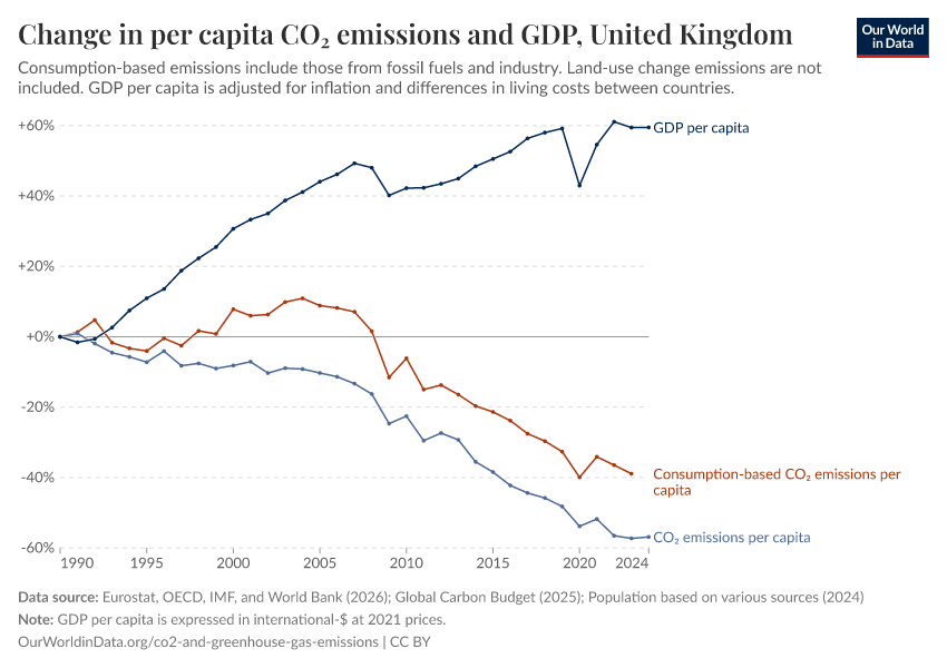 Take the UK as an example. It is shown in the chart. This chart shows the change in GDP and annual CO2 emissions per capita since 1990. We see that the UK’s GDP has increased a lot over the last 30 years while its emissions have fallen. You can also see the data without per capita adjustments.