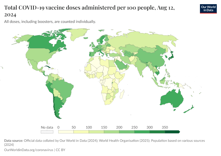 The following map and chart show the number of vaccine doses administered per 100 people within a given population. Each dose, including boosters, is counted as an individual dose.