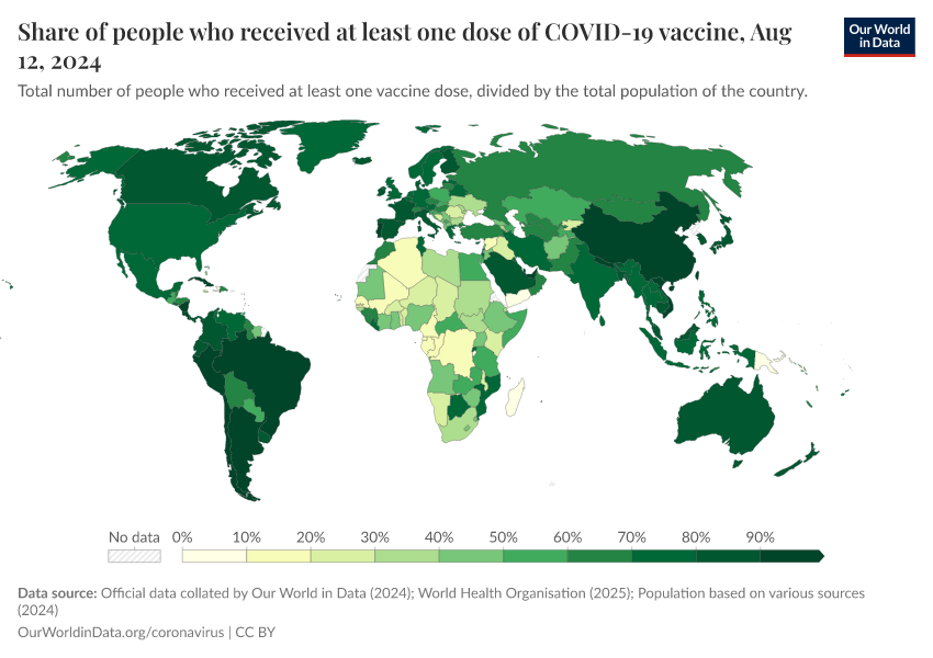 - The official data may report a vaccination coverage rate that refers to the share of people vaccinated in the population eligible for vaccination (very often, among adults only) rather than the total population. Our priority is to make our data comparable between countries — regardless of criteria for eligibility, which tend to vary across countries and across time. For this reason, we always use the total population of the country (i.e. people of all ages) as the denominator.