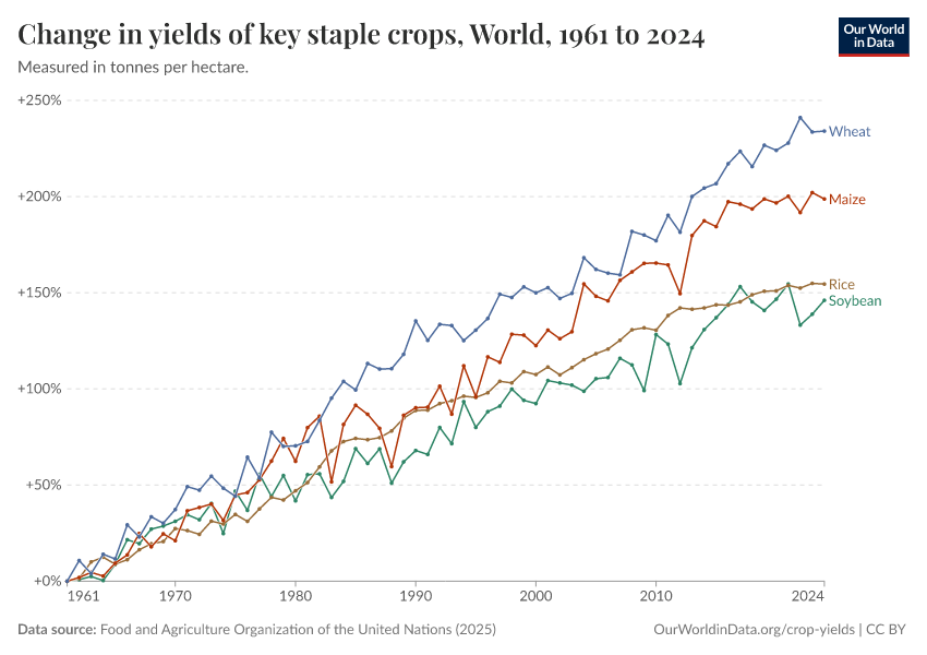 The chart below shows the actual change in crop yields globally over this period. Wheat yields have grown by 225%, maize by 196%, soybean by 153%, and rice by 146%. This growth has been driven by improvements in seed varieties, fertilizers, pesticides, irrigation, and better farming practices.