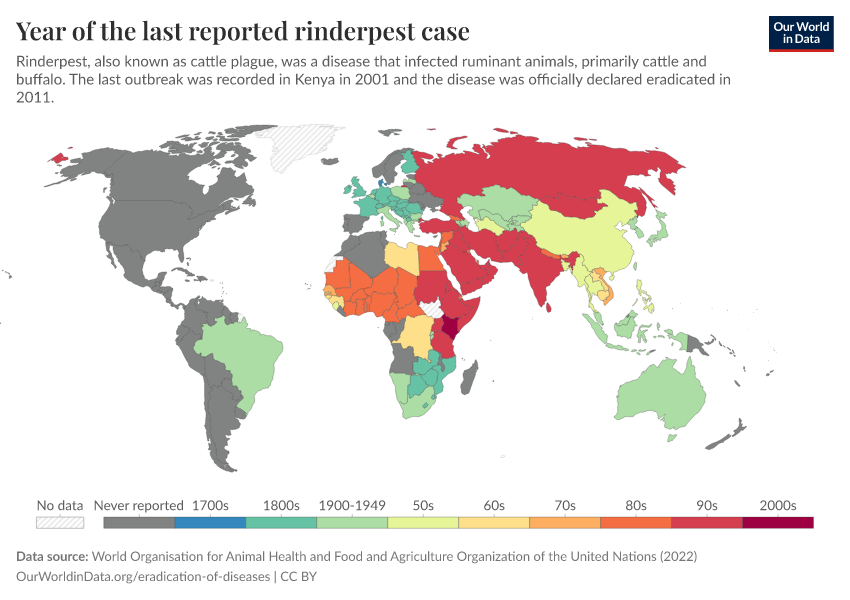 The map here shows the last year in which cases of rinderpest were reported in a country. In 1960 an English veterinary scientist Walter Plowright developed a vaccine against rinderpest, which finally led to its eradication.