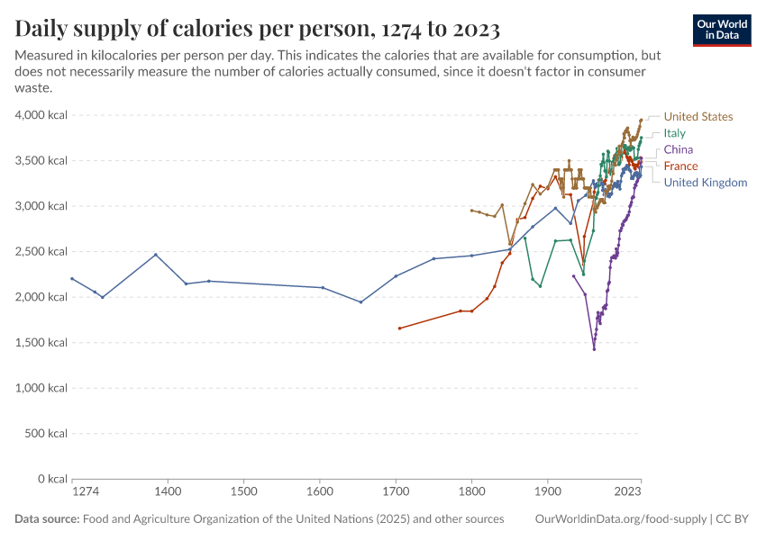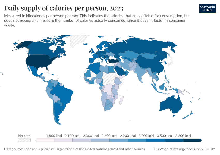 Max Roser, Hannah Ritchie, and Pablo Rosado (2013) - “Food Supply” Published online at OurWorldinData.org. Retrieved from: 'https://data-faostat-update-datasets.owid.pages.dev/food-supply' [Online Resource]BibTeX citation
