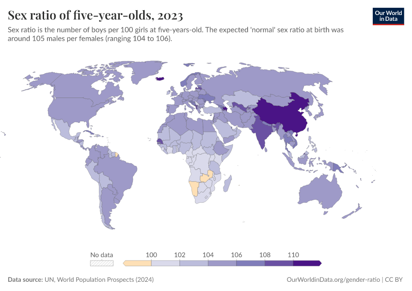 The map below shows the sex ratio among five-year-olds across the world. Just as with the sex ratio at birth, we see the highest ratios in several Asian countries, where the share of boys is higher than we would expect.