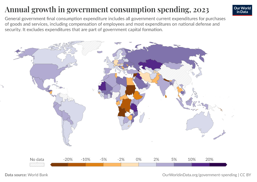 “Data Page: Annual growth in government consumption spending”. Our World in Data (2026). Data adapted from World Bank. Retrieved from https://data-faostat-update-datasets.owid.pages.dev:8789/20260130-180113/grapher/annual-growth-of-general-government-final-consumption-expenditure.html [online resource] (archived on January 30, 2026).How to cite this data