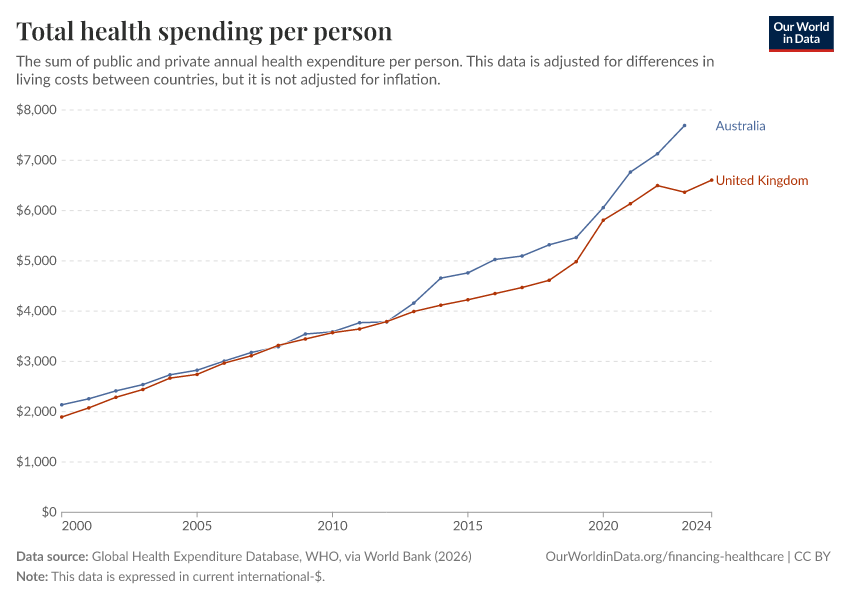 “Data Page: Total health spending per person”. Our World in Data (2026). Data adapted from Global Health Expenditure Database, WHO, via World Bank. Retrieved from https://data-faostat-update-datasets.owid.pages.dev:8789/20260301-082651/grapher/annual-healthcare-expenditure-per-capita.html [online resource] (archived on March 1, 2026).How to cite this data