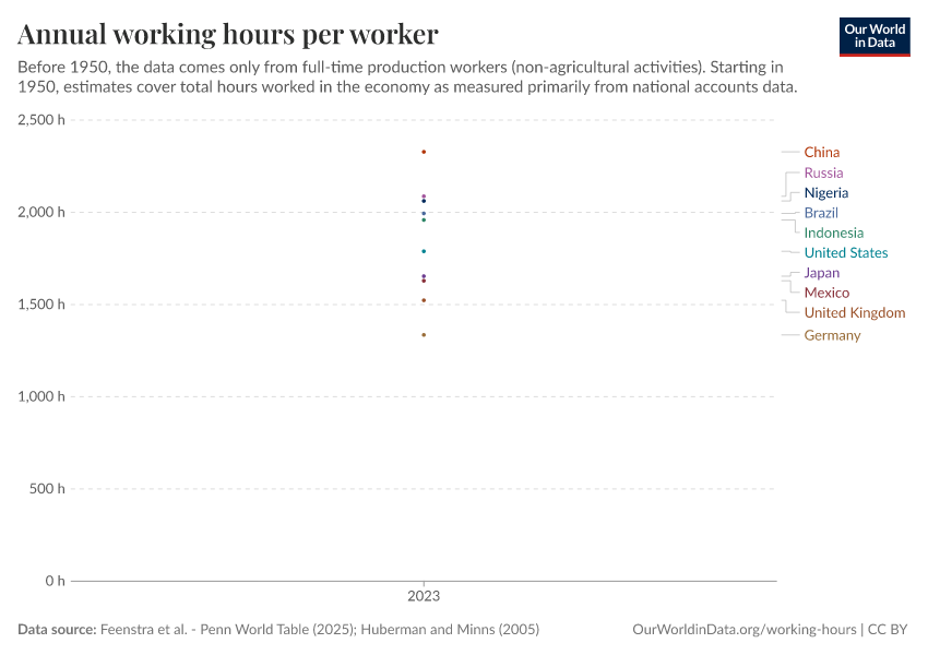 “Data Page: Annual working hours per worker”, part of the following publication: Charlie Giattino, Esteban Ortiz-Ospina, and Max Roser (2020) - “Working Hours”. Data adapted from Feenstra et al., Huberman and Minns. Retrieved from https://data-faostat-update-datasets.owid.pages.dev:8789/20251013-111729/grapher/annual-working-hours-per-worker.html [online resource] (archived on October 13, 2025).