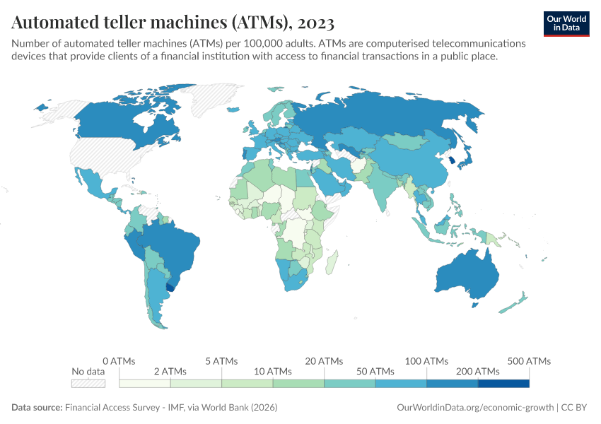“Data Page: Automated teller machines (ATMs)”. Our World in Data (2026). Data adapted from Financial Access Survey - IMF, via World Bank. Retrieved from https://data-faostat-update-datasets.owid.pages.dev:8789/20260301-083443/grapher/automated-teller-machines-atms-per-100000-adults.html [online resource] (archived on March 1, 2026).How to cite this data