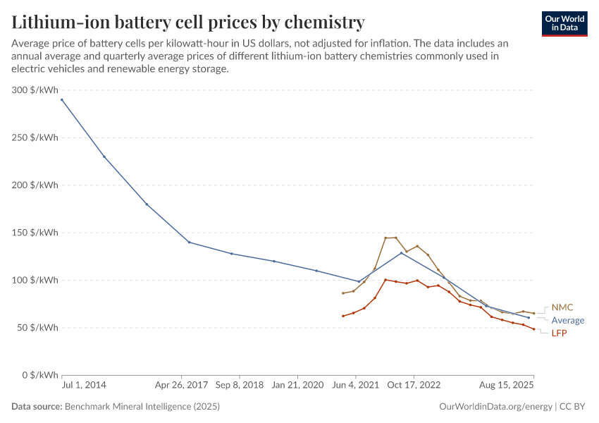 Benchmark Mineral Intelligence (2025) – with minor processing by Our World in Data. “Lithium-ion battery cell prices by chemistry” [dataset]. Benchmark Mineral Intelligence, “Lithium-ion battery prices”; Benchmark Mineral Intelligence, “Battery prices by chemistry” [original data]. Retrieved March 3, 2026 from https://data-faostat-update-datasets.owid.pages.dev:8789/20260108-171008/grapher/average-battery-cell-price.html (archived on January 8, 2026).