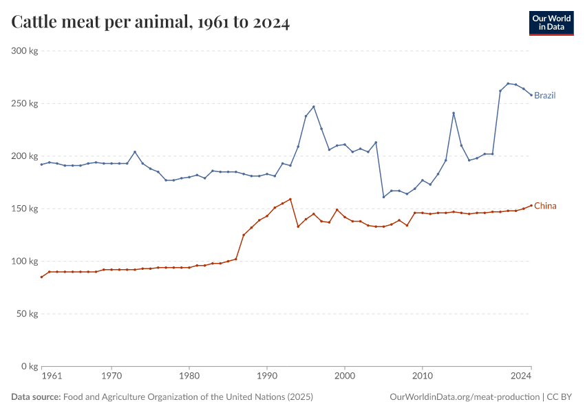 Food and Agriculture Organization of the United Nations (2025) – with major processing by Our World in Data. “Cattle meat yield per animal – UN FAO” [dataset]. Food and Agriculture Organization of the United Nations, “Production: Crops and livestock products” [original data]. Retrieved March 3, 2026 from https://data-faostat-update-datasets.owid.pages.dev:8789/20260226-122020/grapher/cattle-meat-yields-hectograms-100-grams-per-animal.html (archived on February 26, 2026).