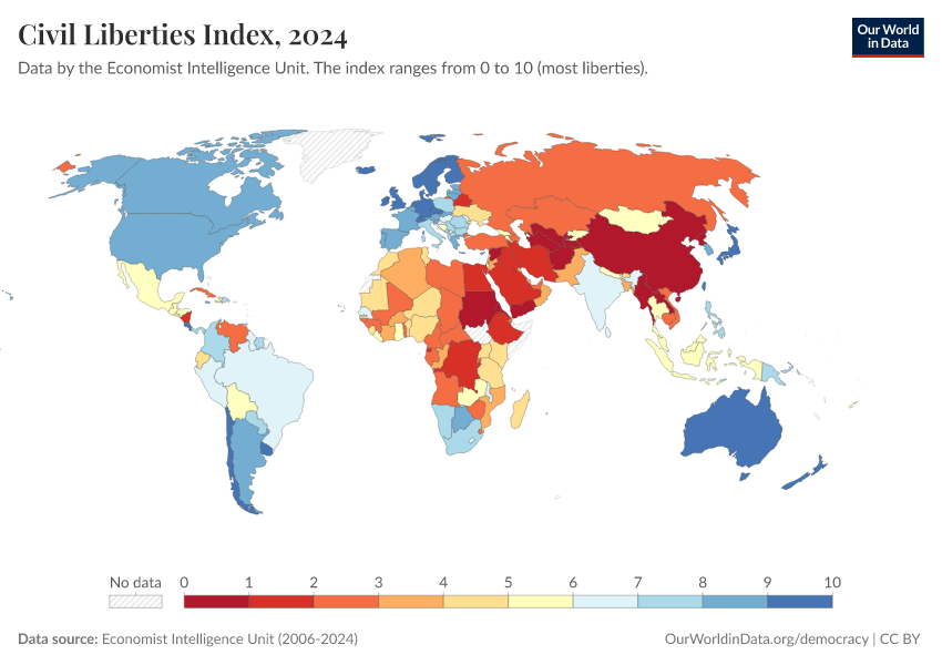 Economist Intelligence Unit (2006-2024) – processed by Our World in Data. “Civil Liberties Index” [dataset]. Economist Intelligence Unit, “Democracy Index 2021: The China challenge”; Economist Intelligence Unit, “Democracy Index 2022: Frontline democracy and the battle for Ukraine”; Economist Intelligence Unit, “Democracy Index 2023: Age of Conflict”; Economist Intelligence Unit, “Democracy Index 2024: What's wrong with representative democracy?”; Gapminder, “Democracy Index v4”; Various sources, “Population” [original data]. Retrieved March 3, 2026 from https://data-faostat-update-datasets.owid.pages.dev:8789/20260119-070102/grapher/civil-liberties-index-eiu.html (archived on January 19, 2026).