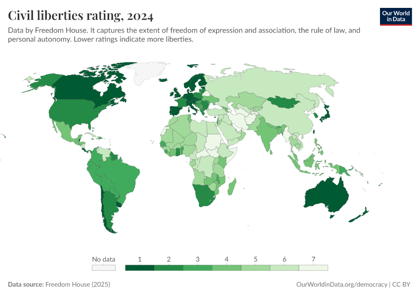 Freedom House (2025) – processed by Our World in Data. “Civil liberties rating” [dataset]. Freedom House, “Freedom in the World” [original data]. Retrieved March 3, 2026 from https://data-faostat-update-datasets.owid.pages.dev:8789/20260119-070102/grapher/civil-liberties-rating-fh.html (archived on January 19, 2026).