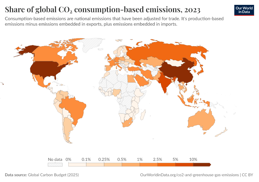 “Data Page: Share of global CO₂ consumption-based emissions”, part of the following publication: Hannah Ritchie, Pablo Rosado, and Max Roser (2023) - “CO₂ and Greenhouse Gas Emissions”. Data adapted from Global Carbon Project. Retrieved from https://data-faostat-update-datasets.owid.pages.dev:8789/20260119-070102/grapher/co2-consumption-share.html [online resource] (archived on January 19, 2026).How to cite this data