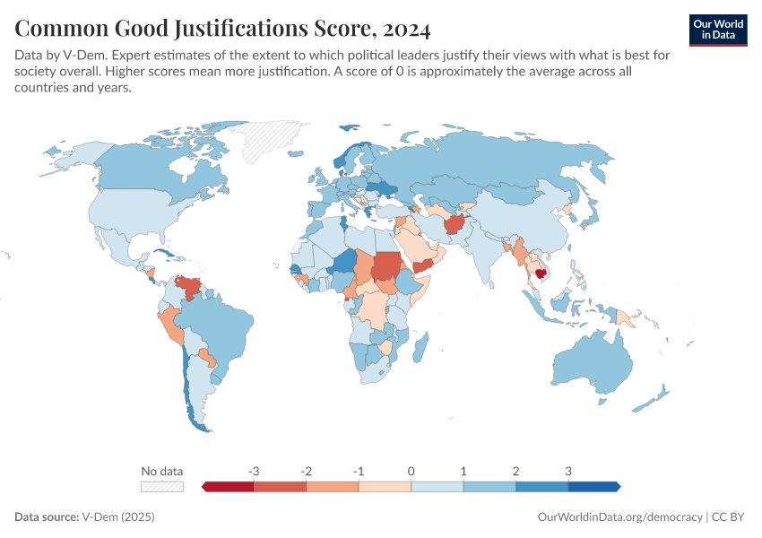 “Data Page: Common good justifications”, part of the following publication: Bastian Herre, Lucas Rodés-Guirao, and Esteban Ortiz-Ospina (2013) - “Democracy”. Data adapted from V-Dem. Retrieved from https://data-faostat-update-datasets.owid.pages.dev:8789/20260204-170225/grapher/common-good-justifications-score.html [online resource] (archived on February 4, 2026).How to cite this data