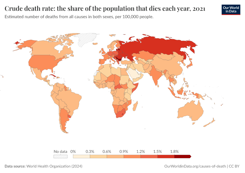 World Health Organization (2024) – with major processing by Our World in Data. “Crude death rate: the share of the population that dies each year” [dataset]. World Health Organization, “Global Health Estimates” [original data]. Retrieved March 3, 2026 from https://data-faostat-update-datasets.owid.pages.dev:8789/20250909-093708/grapher/crude-death-rate-the-share-of-the-population-that-dies-each-year-who.html (archived on September 9, 2025).