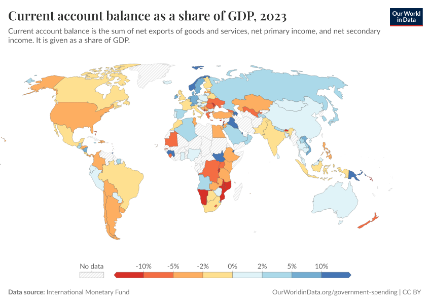 “Data Page: Current account balance as a share of GDP”. Our World in Data (2026). Data adapted from International Monetary Fund. Retrieved from https://data-faostat-update-datasets.owid.pages.dev:8789/20251120-211749/grapher/current-account-balance-as-a-proportion-of-gdp.html [online resource] (archived on November 20, 2025).How to cite this data