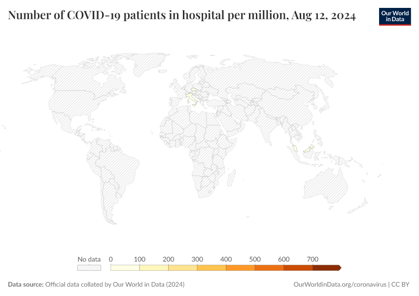 Official data collated by Our World in Data (2024) – processed by Our World in Data. “Number of COVID-19 patients in hospital per million” [dataset]. Official data collated by Our World in Data, “COVID-19, hospitalisations” [original data]. Retrieved March 3, 2026 from https://data-faostat-update-datasets.owid.pages.dev:8789/20250909-093708/grapher/current-covid-hospitalizations-per-million.html (archived on September 9, 2025).