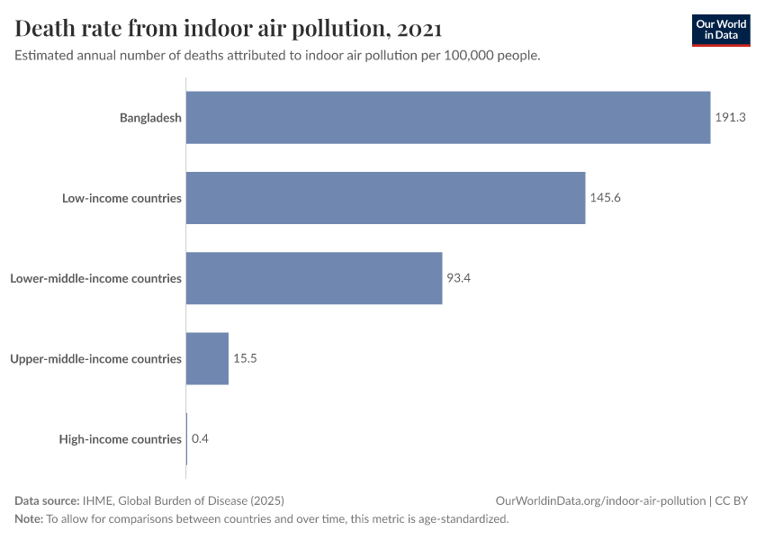IHME, Global Burden of Disease (2025) – with major processing by Our World in Data. “Death rate from indoor air pollution” [dataset]. IHME, Global Burden of Disease, “Global Burden of Disease - Risk Factors - Deaths” [original data]. Retrieved March 3, 2026 from https://data-faostat-update-datasets.owid.pages.dev:8789/20260213-112438/grapher/death-rate-by-source-from-indoor-air-pollution.html (archived on February 13, 2026).