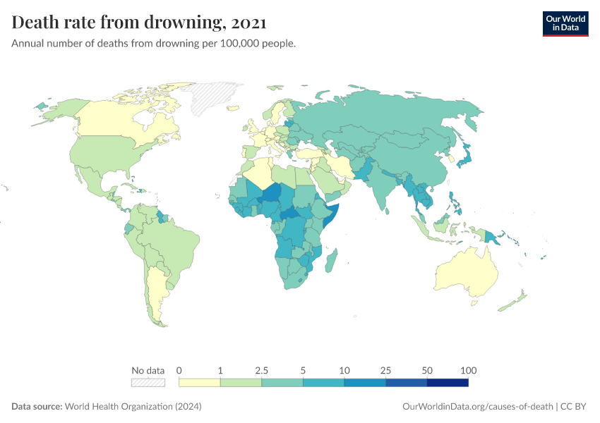 World Health Organization (2024) – with major processing by Our World in Data. “Death rate from drowning” [dataset]. World Health Organization, “Global Health Estimates” [original data]. Retrieved March 3, 2026 from https://data-faostat-update-datasets.owid.pages.dev:8789/20250909-093708/grapher/death-rate-from-drowning-ghe.html (archived on September 9, 2025).