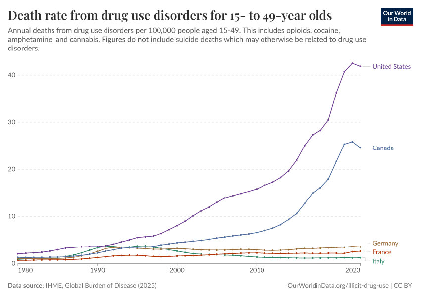 IHME, Global Burden of Disease (2025) – with major processing by Our World in Data. “Death rate from drug use disorders for 15- to 49-year olds” [dataset]. IHME, Global Burden of Disease, “Global Burden of Disease - Deaths” [original data]. Retrieved March 3, 2026 from https://data-faostat-update-datasets.owid.pages.dev:8789/20260211-174736/grapher/death-rate-from-drug-use-disorders-for-15--to-49-year-olds.html (archived on February 11, 2026).