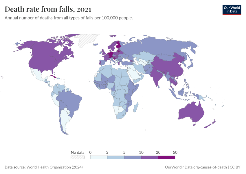 World Health Organization (2024) – with major processing by Our World in Data. “Death rate from falls” [dataset]. World Health Organization, “Global Health Estimates” [original data]. Retrieved March 3, 2026 from https://data-faostat-update-datasets.owid.pages.dev:8789/20250909-093708/grapher/death-rate-from-falls.html (archived on September 9, 2025).