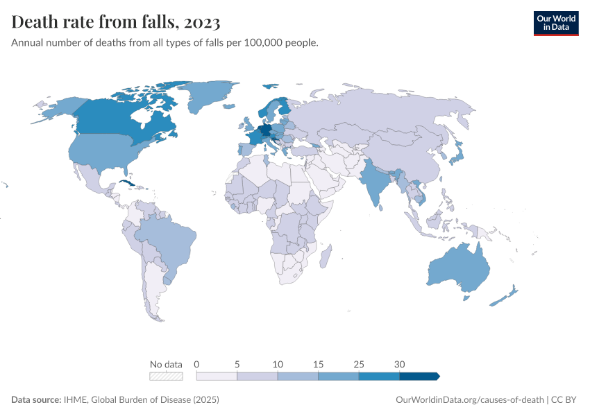IHME, Global Burden of Disease (2025) – with major processing by Our World in Data. “Death rate from falls” [dataset]. IHME, Global Burden of Disease, “Global Burden of Disease - Deaths” [original data]. Retrieved March 3, 2026 from https://data-faostat-update-datasets.owid.pages.dev:8789/20260211-174736/grapher/death-rate-from-falls-gbd-rate.html (archived on February 11, 2026).