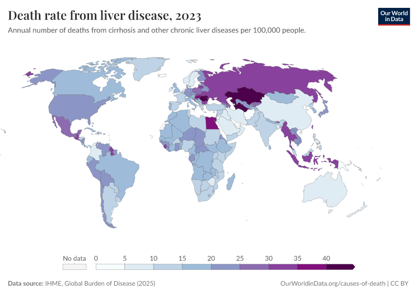 IHME, Global Burden of Disease (2025) – with major processing by Our World in Data. “Death rate from liver disease” [dataset]. IHME, Global Burden of Disease, “Global Burden of Disease - Deaths” [original data]. Retrieved March 3, 2026 from https://data-faostat-update-datasets.owid.pages.dev:8789/20260211-174736/grapher/death-rate-from-liver-disease-gbd.html (archived on February 11, 2026).