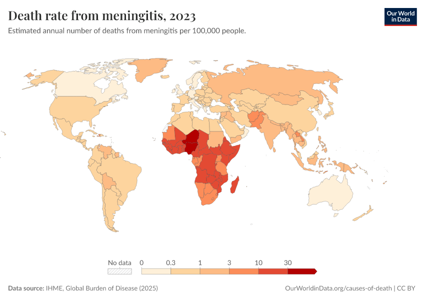 “Data Page: Death rate from meningitis”, part of the following publication: Esteban Ortiz-Ospina and Max Roser (2016) - “Global Health”. Data adapted from IHME, Global Burden of Disease. Retrieved from https://data-faostat-update-datasets.owid.pages.dev:8789/20260211-174736/grapher/death-rate-from-meningitis-gbd.html [online resource] (archived on February 11, 2026).How to cite this data
