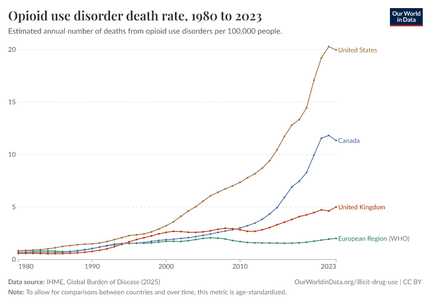 IHME, Global Burden of Disease (2025) – with major processing by Our World in Data. “Opioid use disorder death rate” [dataset]. IHME, Global Burden of Disease, “Global Burden of Disease - Deaths” [original data]. Retrieved March 3, 2026 from https://data-faostat-update-datasets.owid.pages.dev:8789/20260211-174736/grapher/death-rate-from-opioid-use.html (archived on February 11, 2026).
