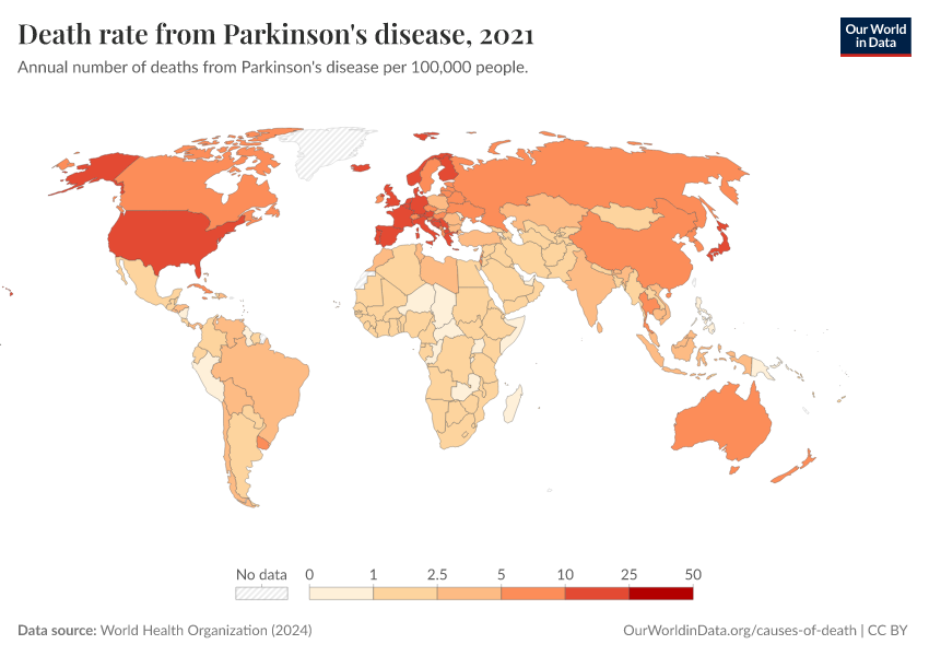 World Health Organization (2024) – with major processing by Our World in Data. “Death rate from Parkinson's disease” [dataset]. World Health Organization, “Global Health Estimates” [original data]. Retrieved March 3, 2026 from https://data-faostat-update-datasets.owid.pages.dev:8789/20250909-093708/grapher/death-rate-from-parkinsons-disease-ghe.html (archived on September 9, 2025).