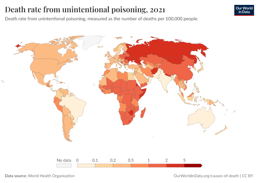 “Data Page: Death rate from unintentional poisoning”. Our World in Data (2026). Data adapted from World Health Organization. Retrieved from https://data-faostat-update-datasets.owid.pages.dev:8789/20260130-180113/grapher/death-rate-from-poisonings.html [online resource] (archived on January 30, 2026).How to cite this data
