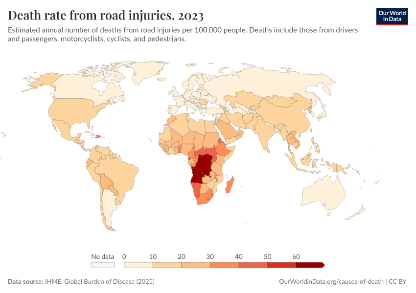 IHME, Global Burden of Disease (2025) – with major processing by Our World in Data. “Death rate from road injuries” [dataset]. IHME, Global Burden of Disease, “Global Burden of Disease - Deaths” [original data]. Retrieved March 3, 2026 from https://data-faostat-update-datasets.owid.pages.dev:8789/20260211-174736/grapher/death-rate-from-road-accidents.html (archived on February 11, 2026).