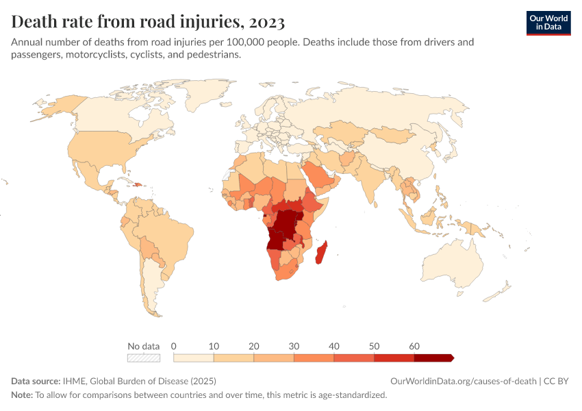 IHME, Global Burden of Disease (2025) – with major processing by Our World in Data. “Death rate from road injuries” [dataset]. IHME, Global Burden of Disease, “Global Burden of Disease - Deaths” [original data]. Retrieved March 3, 2026 from https://data-faostat-update-datasets.owid.pages.dev:8789/20260211-173942/grapher/death-rates-road-incidents.html (archived on February 11, 2026).