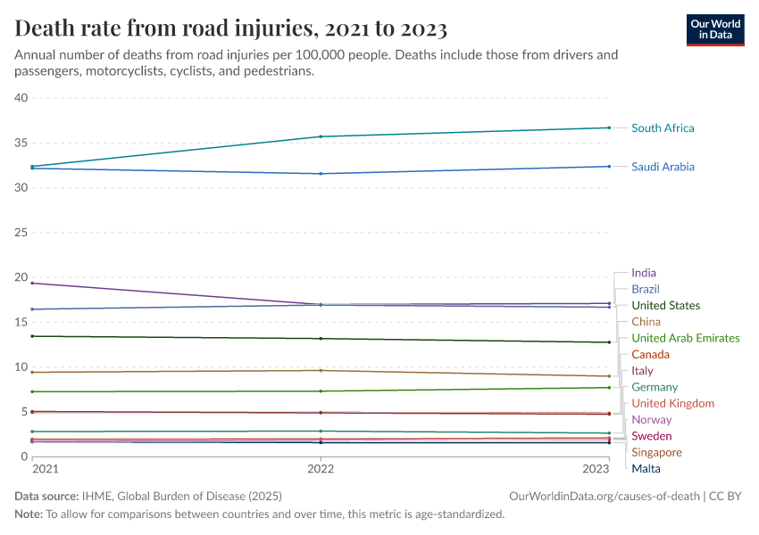 IHME, Global Burden of Disease (2025) – with major processing by Our World in Data. “Death rate from road injuries” [dataset]. IHME, Global Burden of Disease, “Global Burden of Disease - Deaths” [original data]. Retrieved March 3, 2026 from https://data-faostat-update-datasets.owid.pages.dev:8789/20260211-173942/grapher/death-rates-road-incidents.html (archived on February 11, 2026).