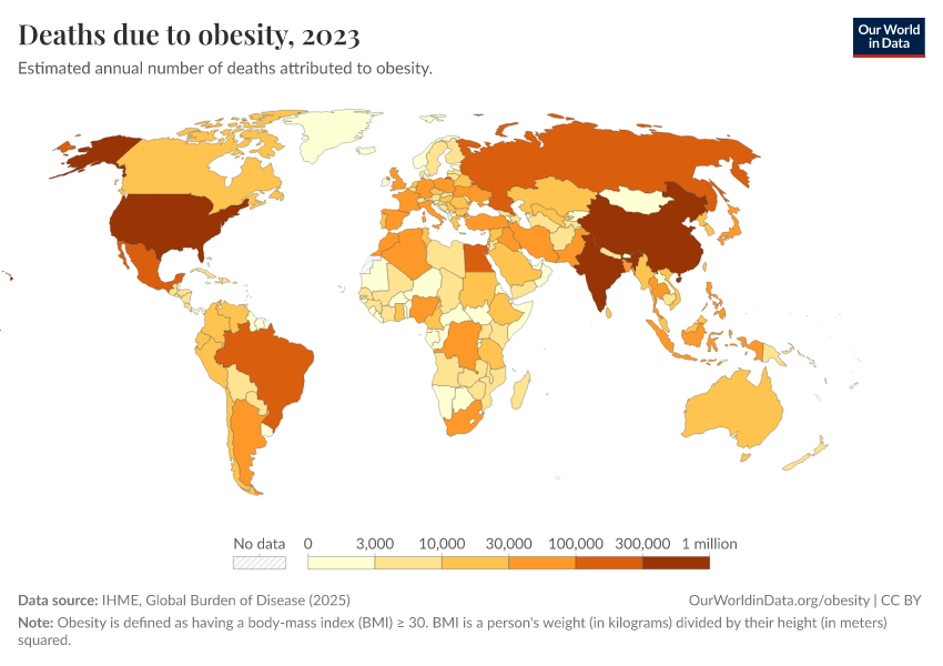 IHME, Global Burden of Disease (2025) – with major processing by Our World in Data. “Deaths due to obesity” [dataset]. IHME, Global Burden of Disease, “Global Burden of Disease - Risk Factors - Deaths” [original data]. Retrieved March 3, 2026 from https://data-faostat-update-datasets.owid.pages.dev:8789/20260213-112438/grapher/deaths-due-to-obesity.html (archived on February 13, 2026).
