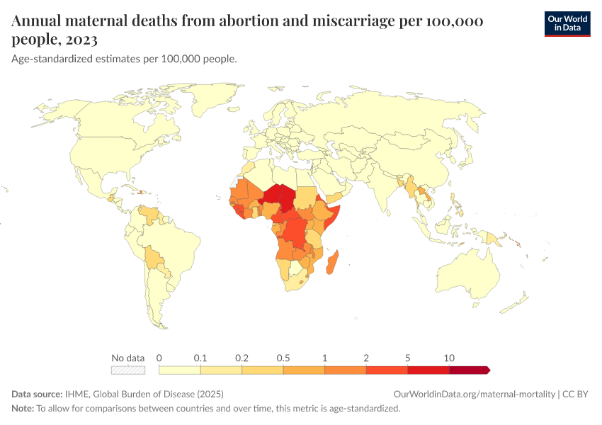 IHME, Global Burden of Disease (2025) – with major processing by Our World in Data. “Annual maternal deaths from abortion and miscarriage per 100,000 people” [dataset]. IHME, Global Burden of Disease, “Global Burden of Disease - Deaths” [original data]. Retrieved March 3, 2026 from https://data-faostat-update-datasets.owid.pages.dev:8789/20260211-174736/grapher/deaths-from-abortion-and-miscarriage-per-100000-people.html (archived on February 11, 2026).