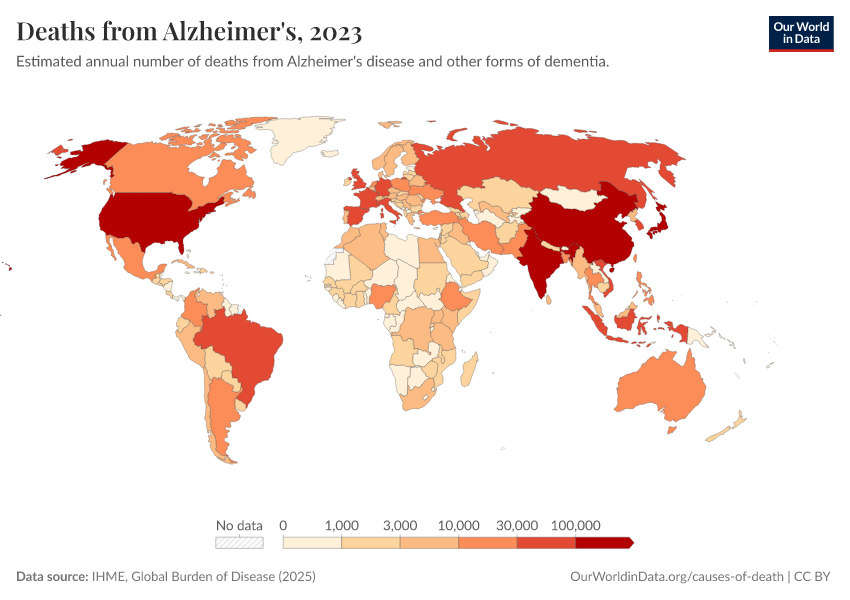 IHME, Global Burden of Disease (2025) – with major processing by Our World in Data. “Deaths from Alzheimer's” [dataset]. IHME, Global Burden of Disease, “Global Burden of Disease - Deaths” [original data]. Retrieved March 3, 2026 from https://data-faostat-update-datasets.owid.pages.dev:8789/20260211-174736/grapher/deaths-from-alzheimers.html (archived on February 11, 2026).