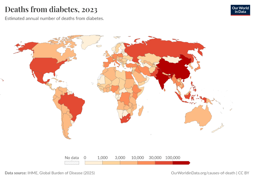 “Data Page: Deaths from diabetes”, part of the following publication: Esteban Ortiz-Ospina and Max Roser (2016) - “Global Health”. Data adapted from IHME, Global Burden of Disease. Retrieved from https://data-faostat-update-datasets.owid.pages.dev:8789/20260211-174736/grapher/deaths-from-diabetes.html [online resource] (archived on February 11, 2026).How to cite this data