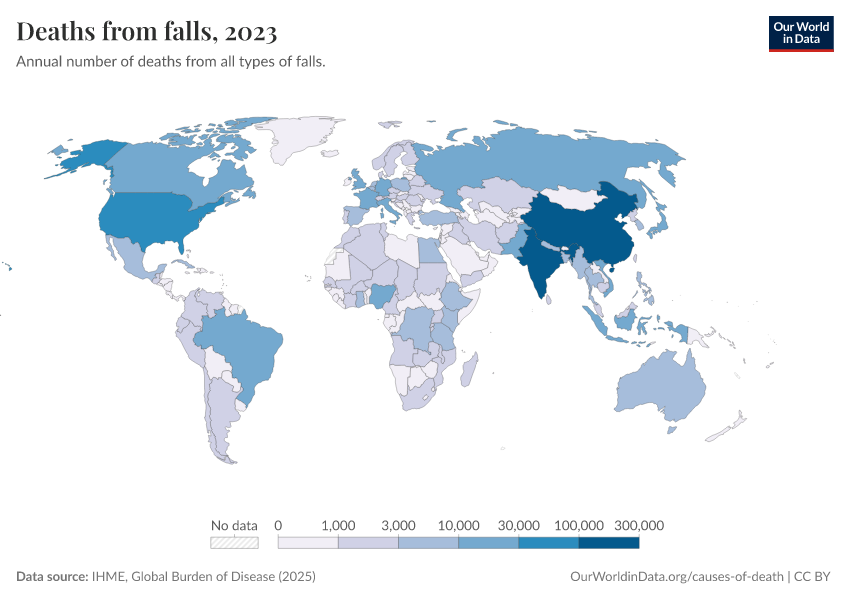 IHME, Global Burden of Disease (2025) – with major processing by Our World in Data. “Deaths from falls” [dataset]. IHME, Global Burden of Disease, “Global Burden of Disease - Deaths” [original data]. Retrieved March 3, 2026 from https://data-faostat-update-datasets.owid.pages.dev:8789/20260211-174736/grapher/deaths-from-falls-gbd.html (archived on February 11, 2026).