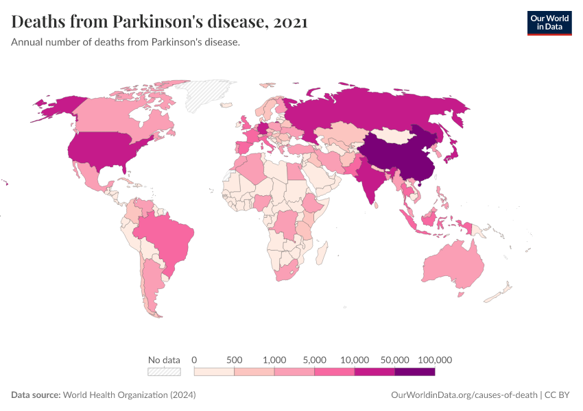 World Health Organization (2024) – with major processing by Our World in Data. “Deaths from Parkinson's disease” [dataset]. World Health Organization, “Global Health Estimates” [original data]. Retrieved March 3, 2026 from https://data-faostat-update-datasets.owid.pages.dev:8789/20250909-093708/grapher/deaths-from-parkinsons-disease-ghe.html (archived on September 9, 2025).