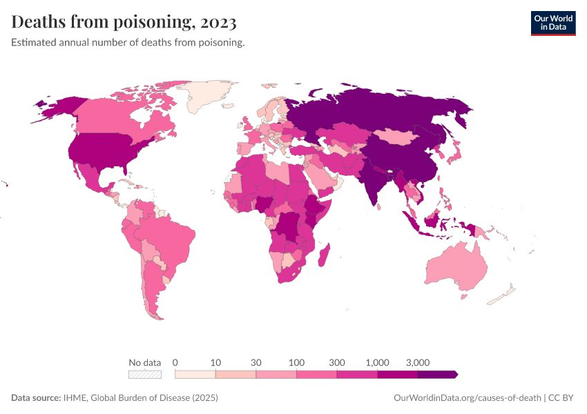 IHME, Global Burden of Disease (2025) – with major processing by Our World in Data. “Deaths from poisoning” [dataset]. IHME, Global Burden of Disease, “Global Burden of Disease - Deaths” [original data]. Retrieved March 3, 2026 from https://data-faostat-update-datasets.owid.pages.dev:8789/20260211-174736/grapher/deaths-from-poisoning.html (archived on February 11, 2026).