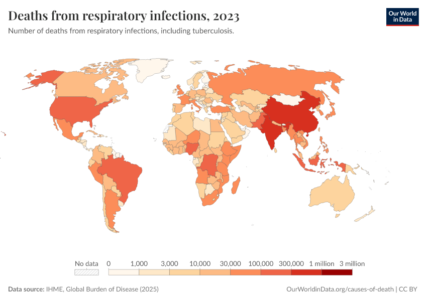 IHME, Global Burden of Disease (2025) – with major processing by Our World in Data. “Deaths from respiratory infections” [dataset]. IHME, Global Burden of Disease, “Global Burden of Disease - Deaths” [original data]. Retrieved March 3, 2026 from https://data-faostat-update-datasets.owid.pages.dev:8789/20260211-174736/grapher/deaths-from-respiratory-infections.html (archived on February 11, 2026).