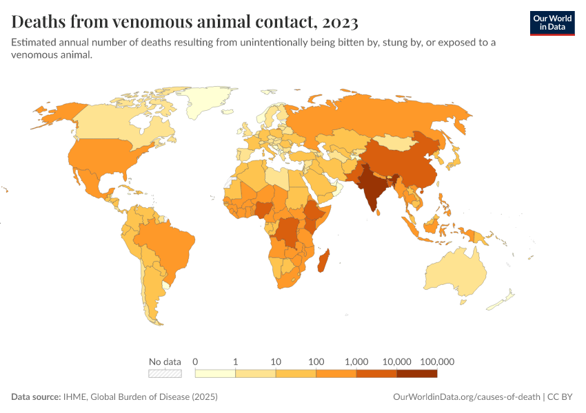 “Data Page: Deaths from venomous animal contact”, part of the following publication: Esteban Ortiz-Ospina and Max Roser (2016) - “Global Health”. Data adapted from IHME, Global Burden of Disease. Retrieved from https://data-faostat-update-datasets.owid.pages.dev:8789/20260211-174736/grapher/deaths-from-venomous-animal-contact.html [online resource] (archived on February 11, 2026).How to cite this data