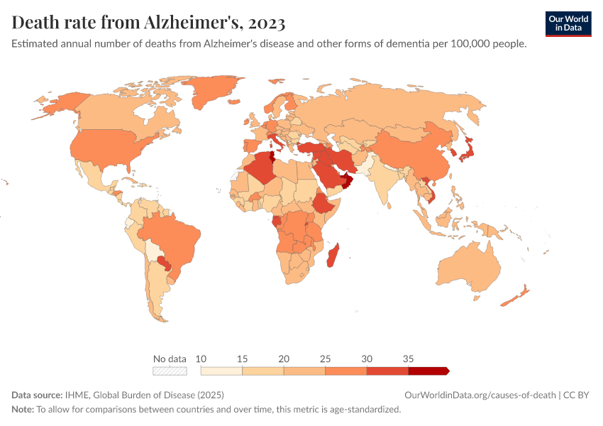 IHME, Global Burden of Disease (2025) – with major processing by Our World in Data. “Death rate from Alzheimer's” [dataset]. IHME, Global Burden of Disease, “Global Burden of Disease - Deaths” [original data]. Retrieved March 3, 2026 from https://data-faostat-update-datasets.owid.pages.dev:8789/20260211-173942/grapher/dementia-death-rates.html (archived on February 11, 2026).