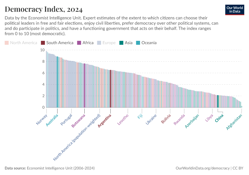 Economist Intelligence Unit (2006-2024) – processed by Our World in Data. “Democracy index – Economist Intelligence Unit” [dataset]. Economist Intelligence Unit, “Democracy Index 2021: The China challenge”; Economist Intelligence Unit, “Democracy Index 2022: Frontline democracy and the battle for Ukraine”; Economist Intelligence Unit, “Democracy Index 2023: Age of Conflict”; Economist Intelligence Unit, “Democracy Index 2024: What's wrong with representative democracy?”; Gapminder, “Democracy Index v4”; Various sources, “Population” [original data]. Retrieved March 3, 2026 from https://data-faostat-update-datasets.owid.pages.dev:8789/20260119-070102/grapher/democracy-index-eiu.html (archived on January 19, 2026).