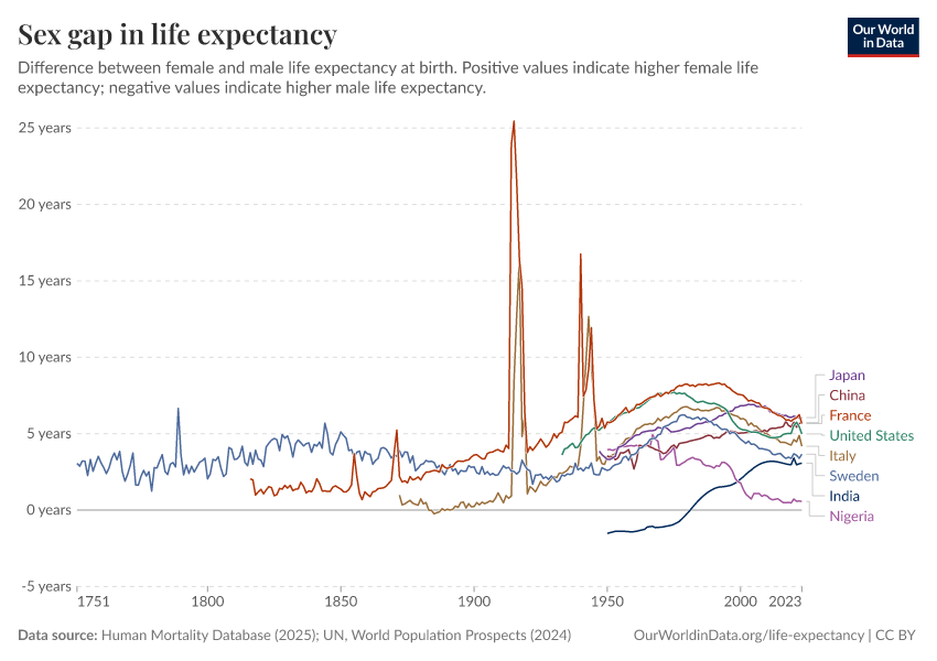 “Data Page: Life expectancy at birth”, part of the following publication: Saloni Dattani, Lucas Rodés-Guirao, Hannah Ritchie, Esteban Ortiz-Ospina, and Max Roser (2023) - “Life Expectancy”. Data adapted from Human Mortality Database, United Nations. Retrieved from https://data-faostat-update-datasets.owid.pages.dev:8789/20251022-222946/grapher/difference-in-female-and-male-life-expectancy-at-birth.html [online resource] (archived on October 22, 2025).