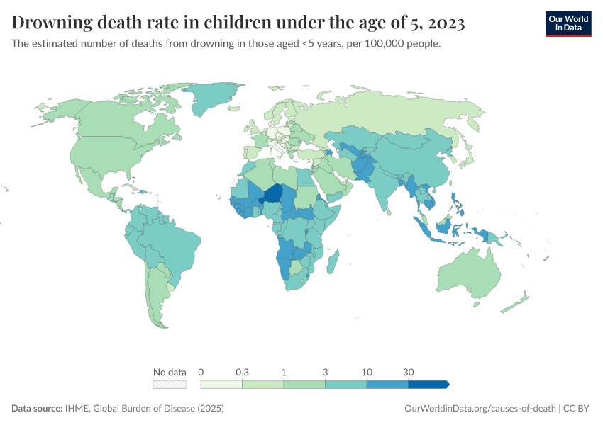 IHME, Global Burden of Disease (2025) – with major processing by Our World in Data. “Drowning death rate in children under the age of 5” [dataset]. IHME, Global Burden of Disease, “Global Burden of Disease - Deaths” [original data]. Retrieved March 3, 2026 from https://data-faostat-update-datasets.owid.pages.dev:8789/20260211-174736/grapher/drowning-death-rates-under-5.html (archived on February 11, 2026).
