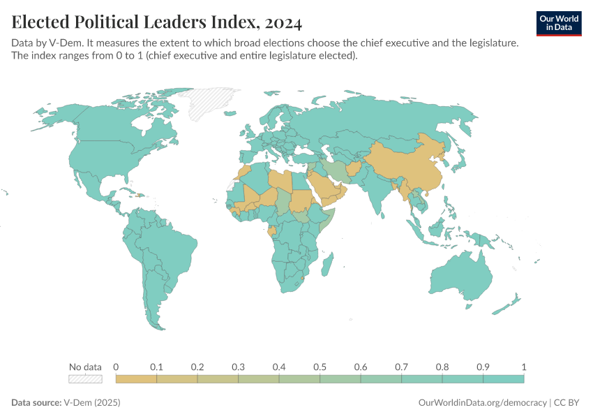 “Data Page: Elected officials index”, part of the following publication: Bastian Herre, Lucas Rodés-Guirao, and Esteban Ortiz-Ospina (2013) - “Democracy”. Data adapted from V-Dem. Retrieved from https://data-faostat-update-datasets.owid.pages.dev:8789/20260119-070102/grapher/elected-political-leaders-index.html [online resource] (archived on January 19, 2026).How to cite this data