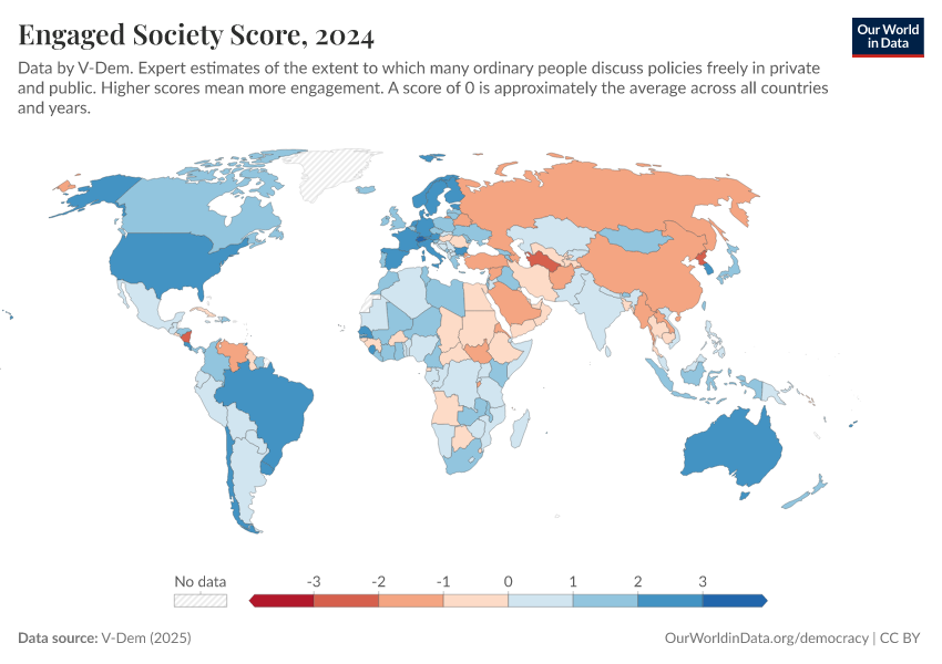 “Data Page: Engaged society”, part of the following publication: Bastian Herre, Lucas Rodés-Guirao, and Esteban Ortiz-Ospina (2013) - “Democracy”. Data adapted from V-Dem. Retrieved from https://data-faostat-update-datasets.owid.pages.dev:8789/20260204-170225/grapher/engaged-society-score.html [online resource] (archived on February 4, 2026).How to cite this data